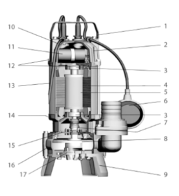 1. Ручка для переноски. 2. Верхняя крышка. 3. Подшипник. 4. Статор. 5. Ротор. 6. Поплавковый выключатель. 7. Сальник. 8. Крыльчатка. 9. Опоры насоса 10. Сетевой кабель. 11. Пусковой конденсатор. 12. Стяжные болты. 13. Корпус статора. 14. Масляная камера. 15. Крышка масляной камеры. 16. Насосная камера. 17. Режущая система/крыльчатка. |