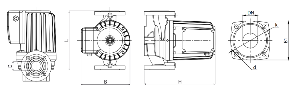 | Модель | L, мм | H, мм | B, мм | DN | В1, мм | k, мм | d, мм | Тип фланца |